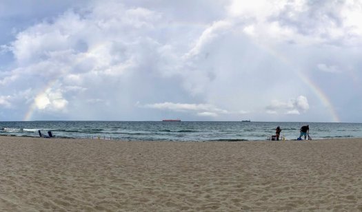 We bought a couple beach chairs and took off for the sand. The clouds were thick and the radar was scary. We watched the clouds head north and south, we remained dry. To our left a rainbow appeared. To the right the other side made it’s way forward. I looked up and said, “Wouldn’t it be amazing if God parted the clouds and gave us the whole rainbow.”