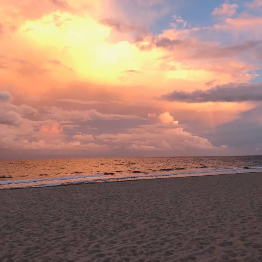 The next day’s weather forecast was worse with some tropical something rolling into the entire southern part of Florida. We considered our options and determined we’d drive to dry land if needed. But we woke up to sunny skies, so we grabbed our little beach chairs and planted ourselves in the sand. The clouds were once again settled all around us. We said a couple prayers, and waited. I looked up, and directly above us, the clouds again dissipated and were splitting to the north and south. We enjoyed the sun on our shoulders, swam in the ocean, talked, laughed, and watched the birds flying everywhere.